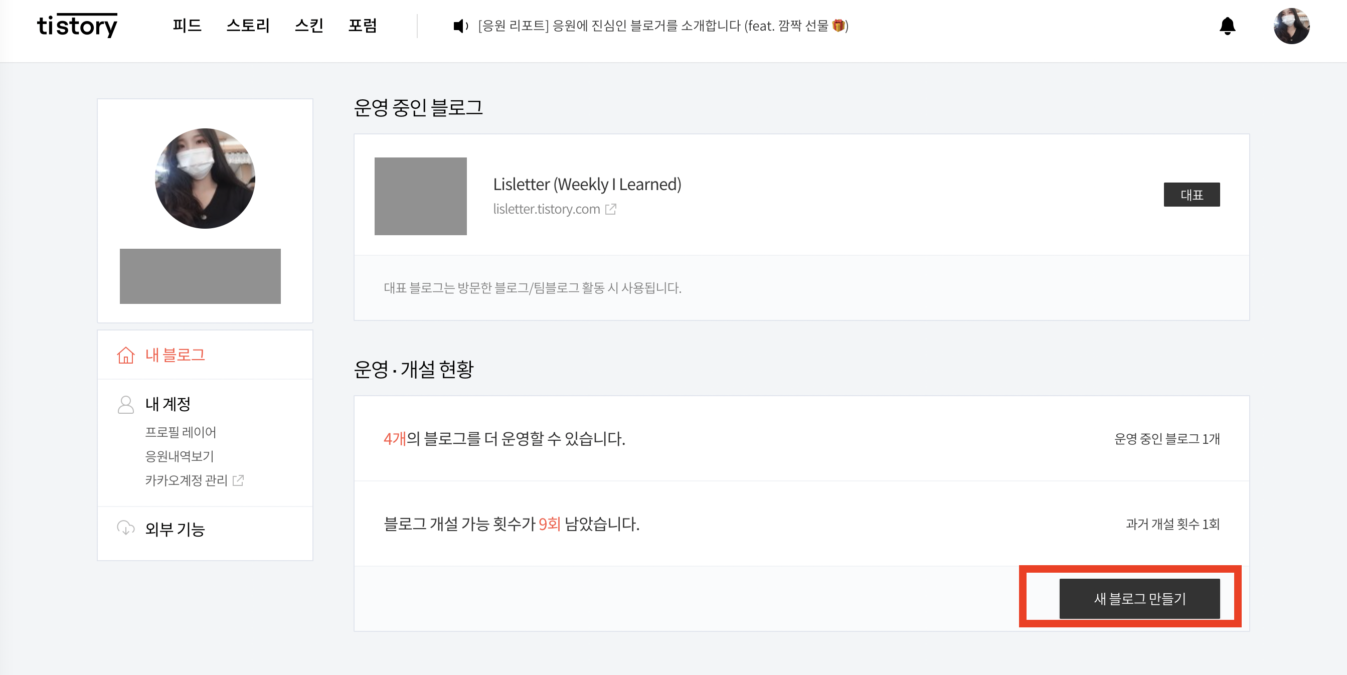 이후 나오는 페이지 우측 하단(안보일 경우 스크롤을 조금 내려서)에 [새 블로그 만들기]를 눌러 블로그를 개설할 수 있다.