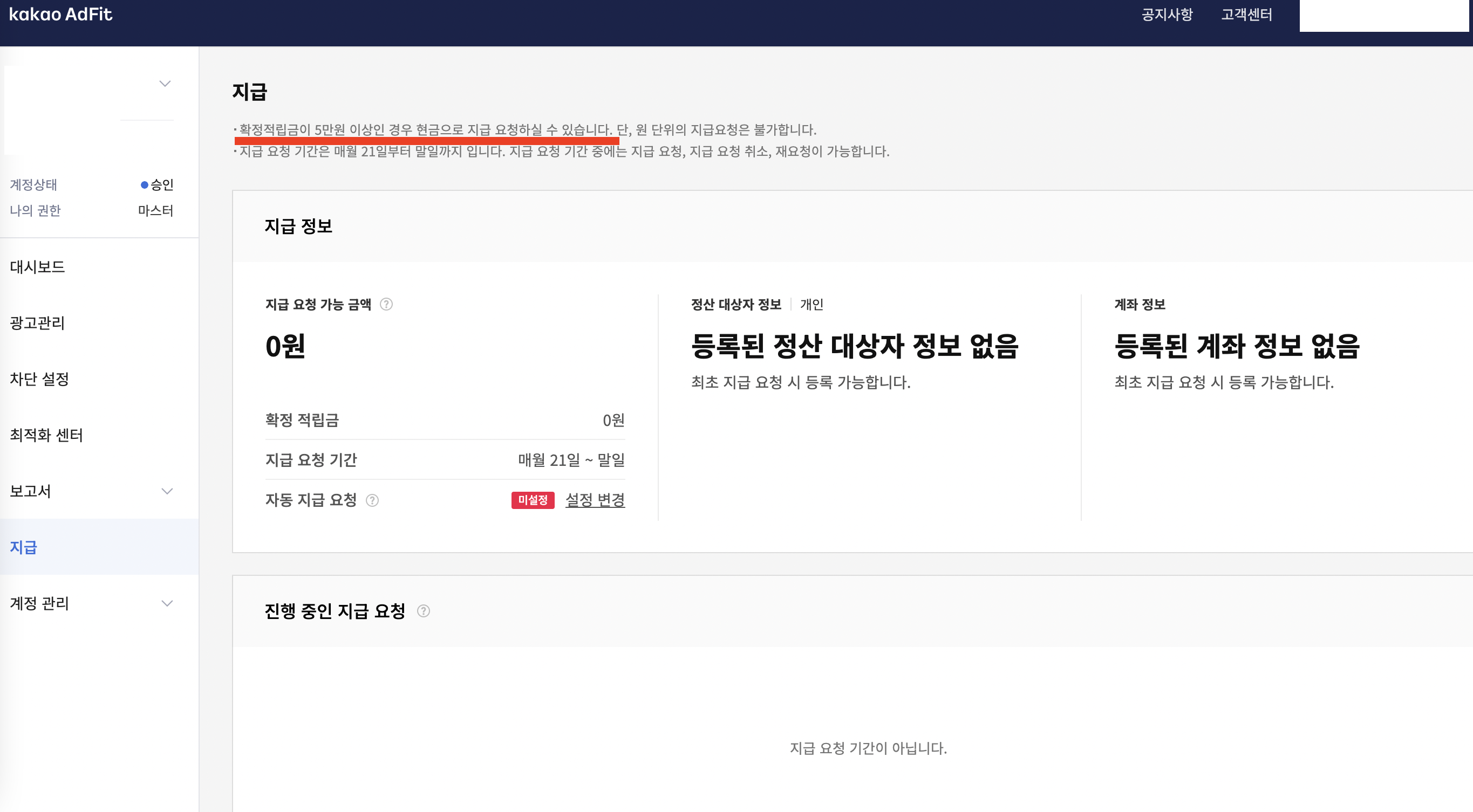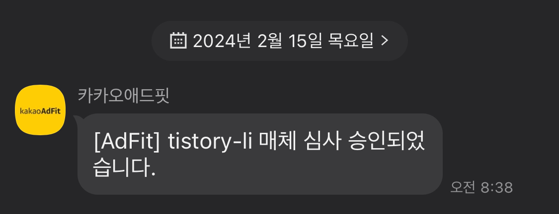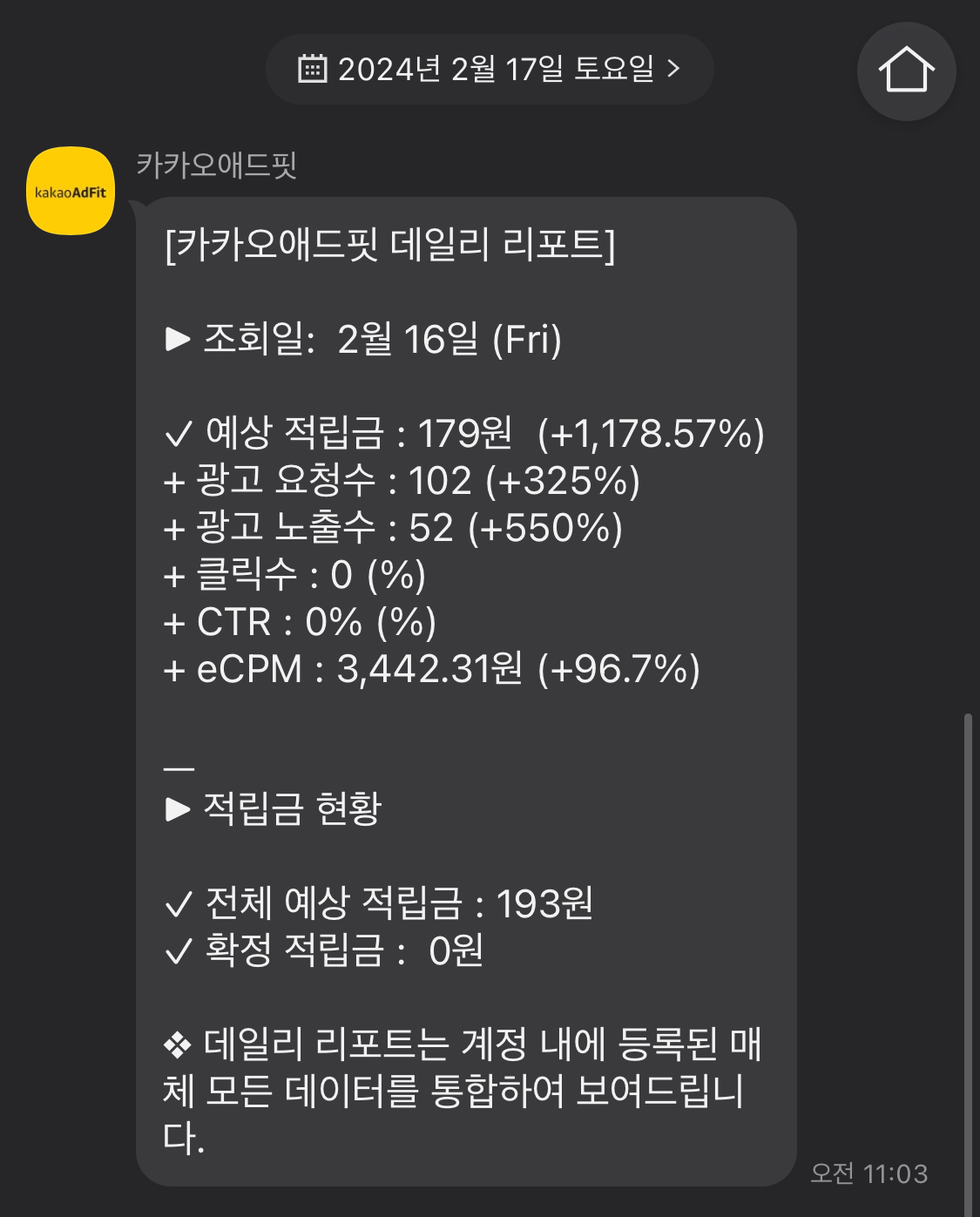 애드핏에 승인이 난 이후, 카카오톡으로 매일 오전 11시 경 연락이 온다.