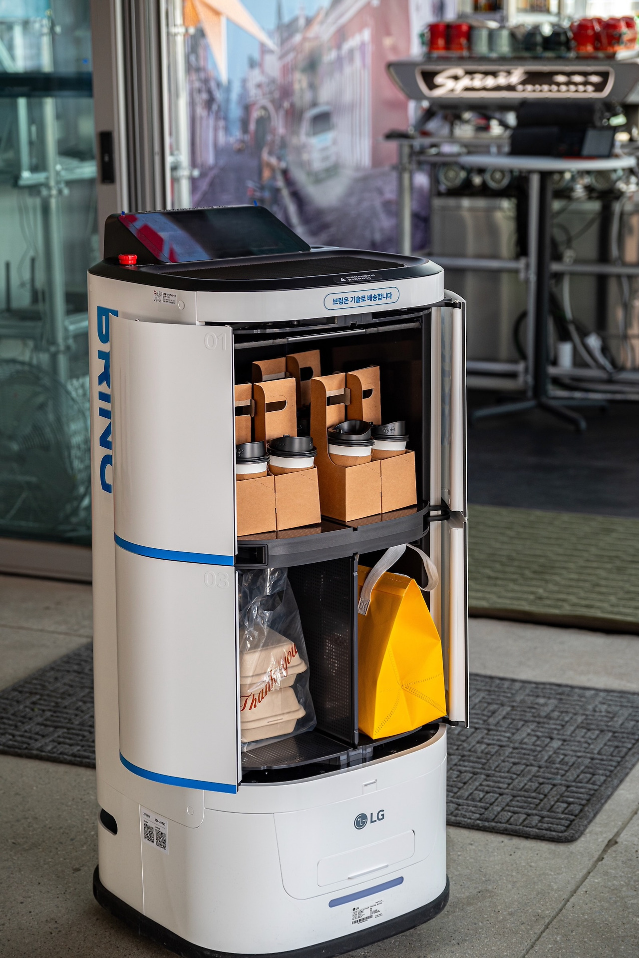 ‘브링'은 배송 로봇과 카카오모빌리티의 로봇 오픈 API 플랫폼 ‘브링온’이 결합된 상품으로 ▲식음료 배달 ▲사무실 내 우편 배달 ▲호텔 내 컨시어지 서비스 등 고객의 현장에서 필요로 하는 다양한 서비스를 하나의 로봇으로 수행할 수 있다. 플랫폼 제어를 통해 사무실・호텔・아파트・병원 등 로봇을 고려해 설계되지 않은 기존 건물에도 바로 배치해 운영할 수 있는 것이 특징이다.