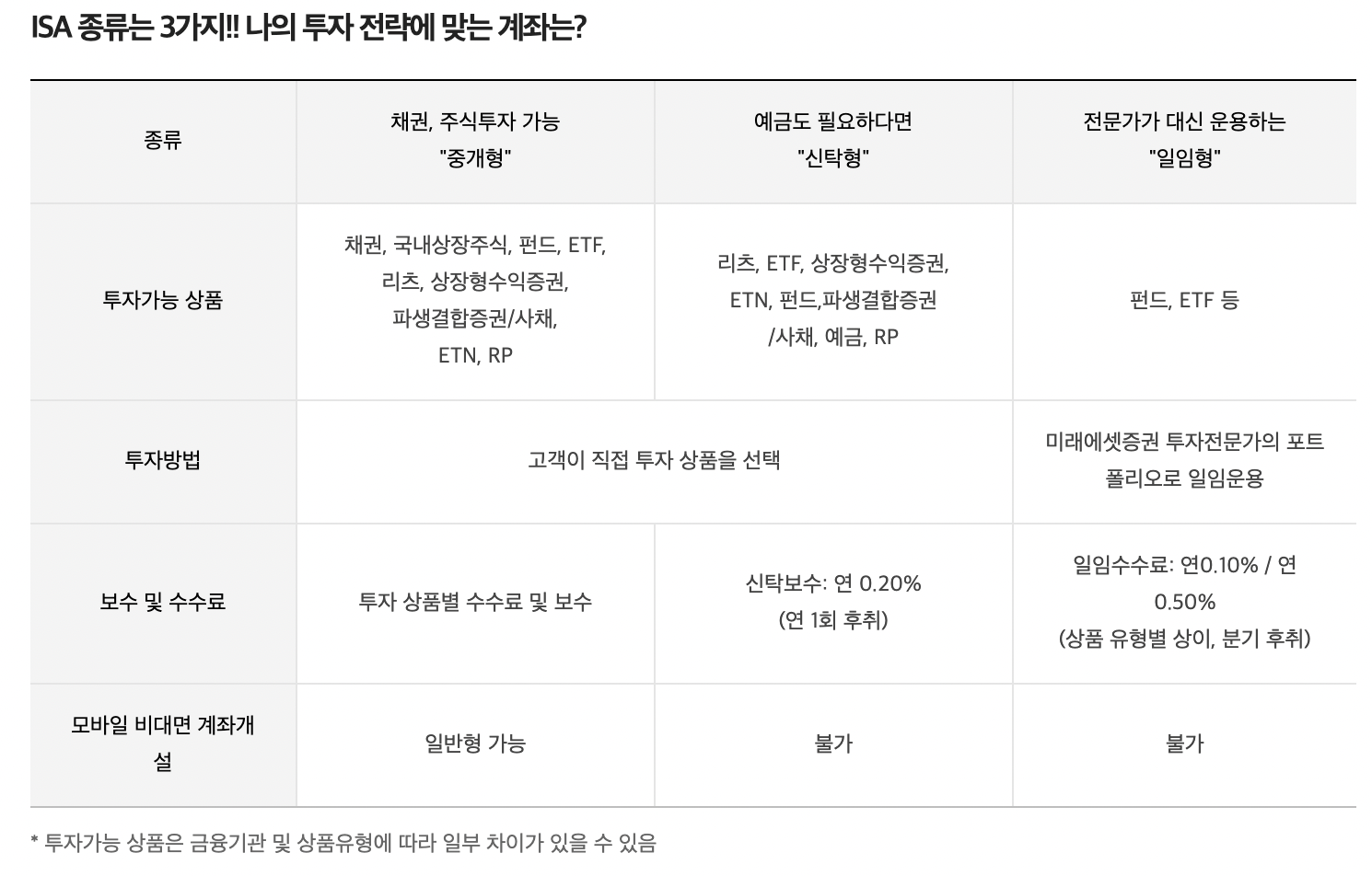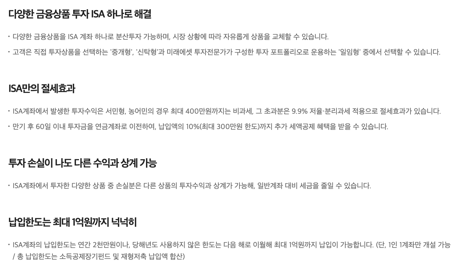 미래에셋증권 준법감시인 심사필 제 24 - 474호 (2024.03.21~2025.03.20) 미래에셋증권 준법감시인 심사필 제 16 - 준190호 (2016.04.07~2017.04.06) --> 다양한 금융상품 투자 ISA 하나로 해결 다양한 금융상품을 IS